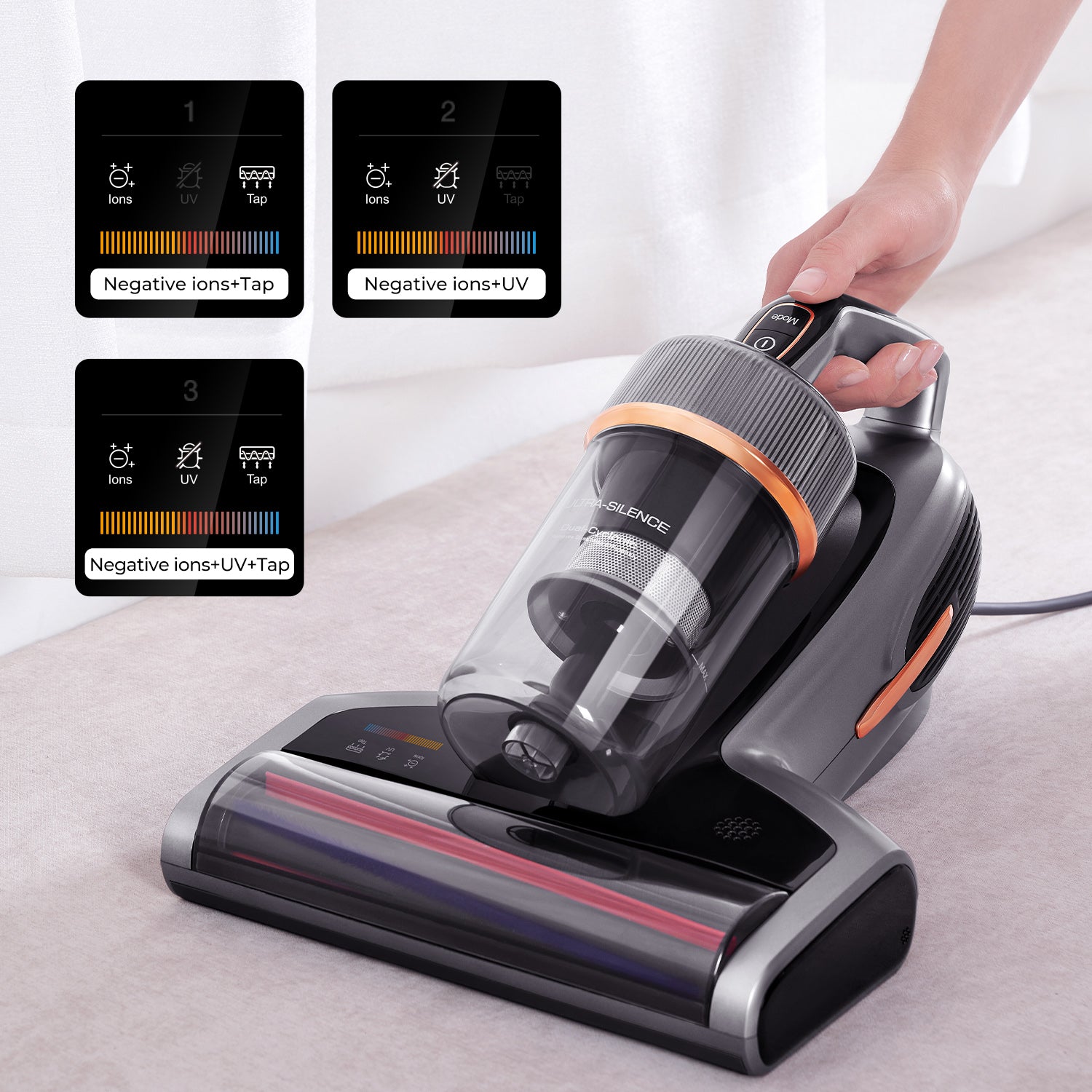 Ordinary handheld vacuum cleaners can only clean visible dust and debris. But many things that affect our health are invisible! Dust mites and their excrement, allergens, bacteria, etc. are hidden in beds, sofas, and carpets, which endanger the health of family members.