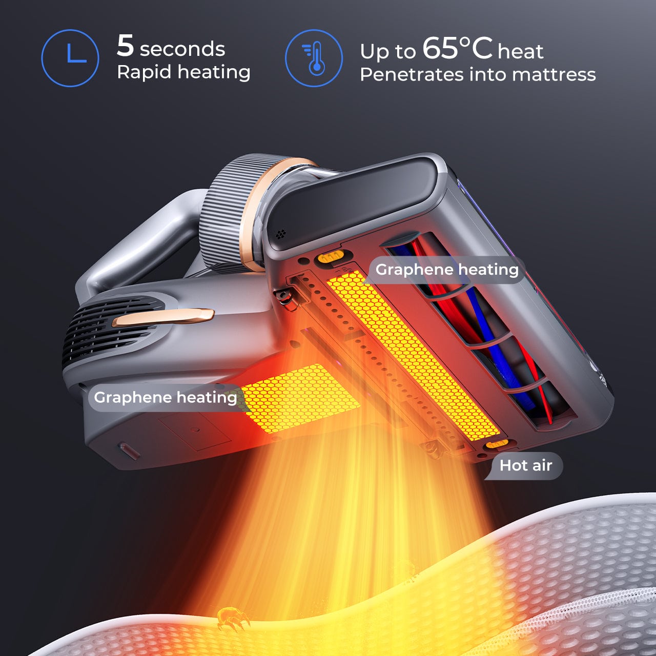 With graphene heating technology, BX7 Pro Max reaches temperature up to 65℃. With constant heat penetrates into deep mattress, effectively removes moisture and bacteria and dust mites. It allows you to enjoy a comfortable sleep even in rainy and cold weather.