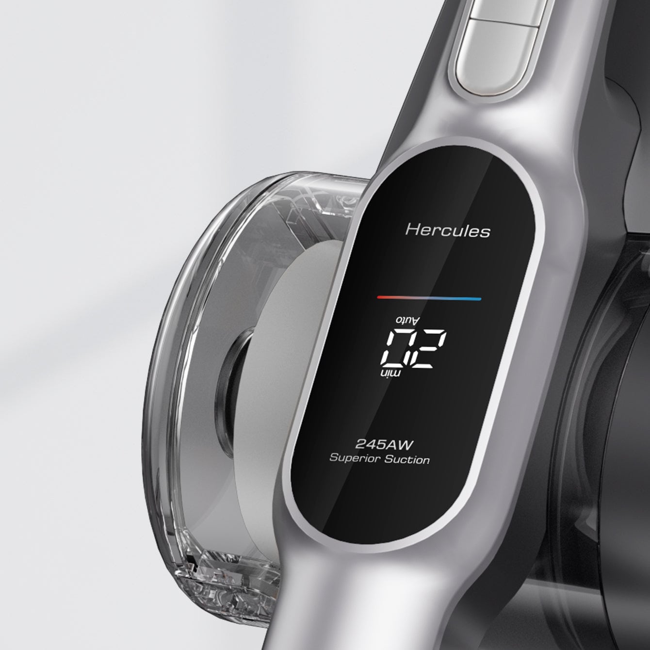 The LED display screen shows remaining run time plus other real-time information such as power mode, dust concentration, error reminder to better control your cleaning.