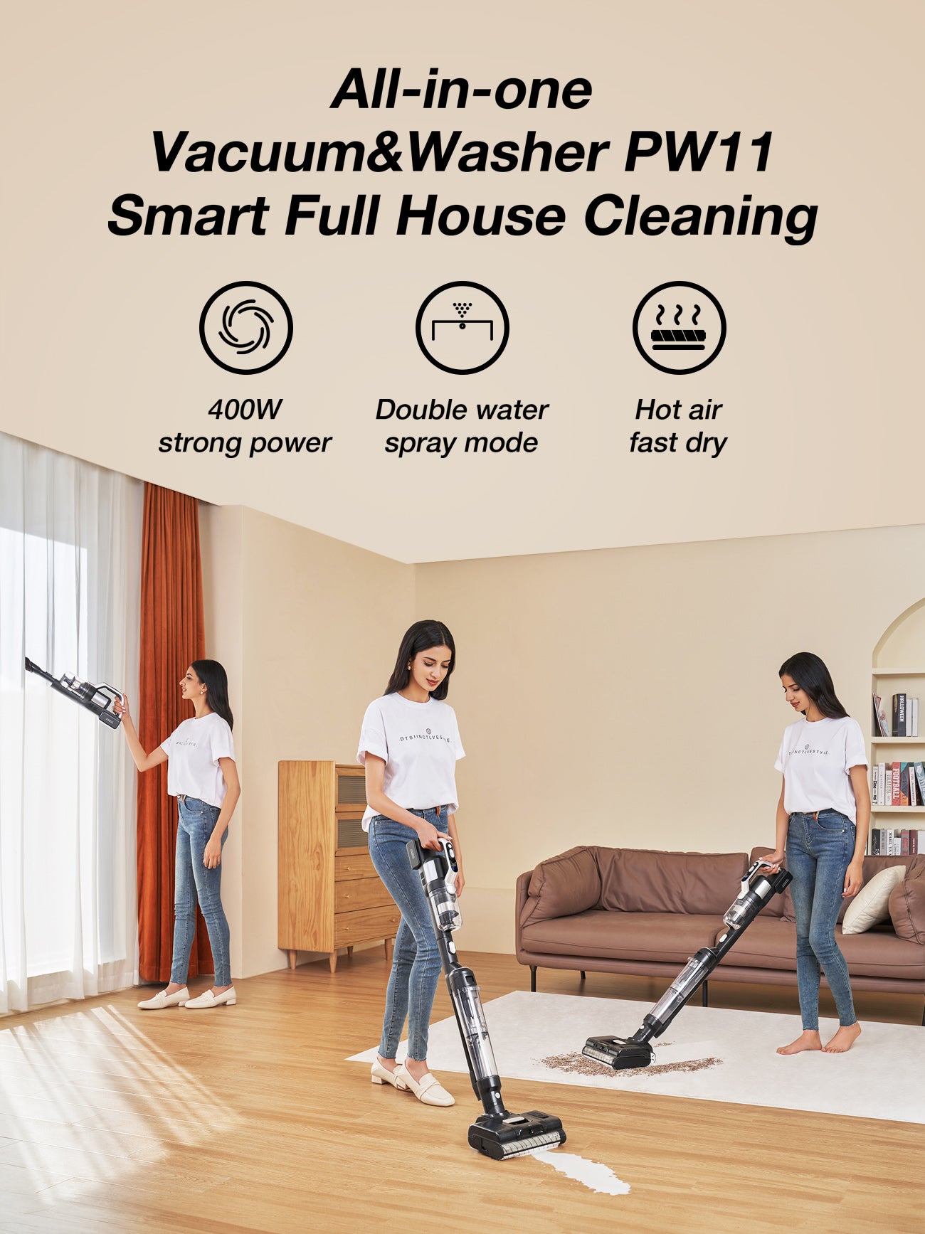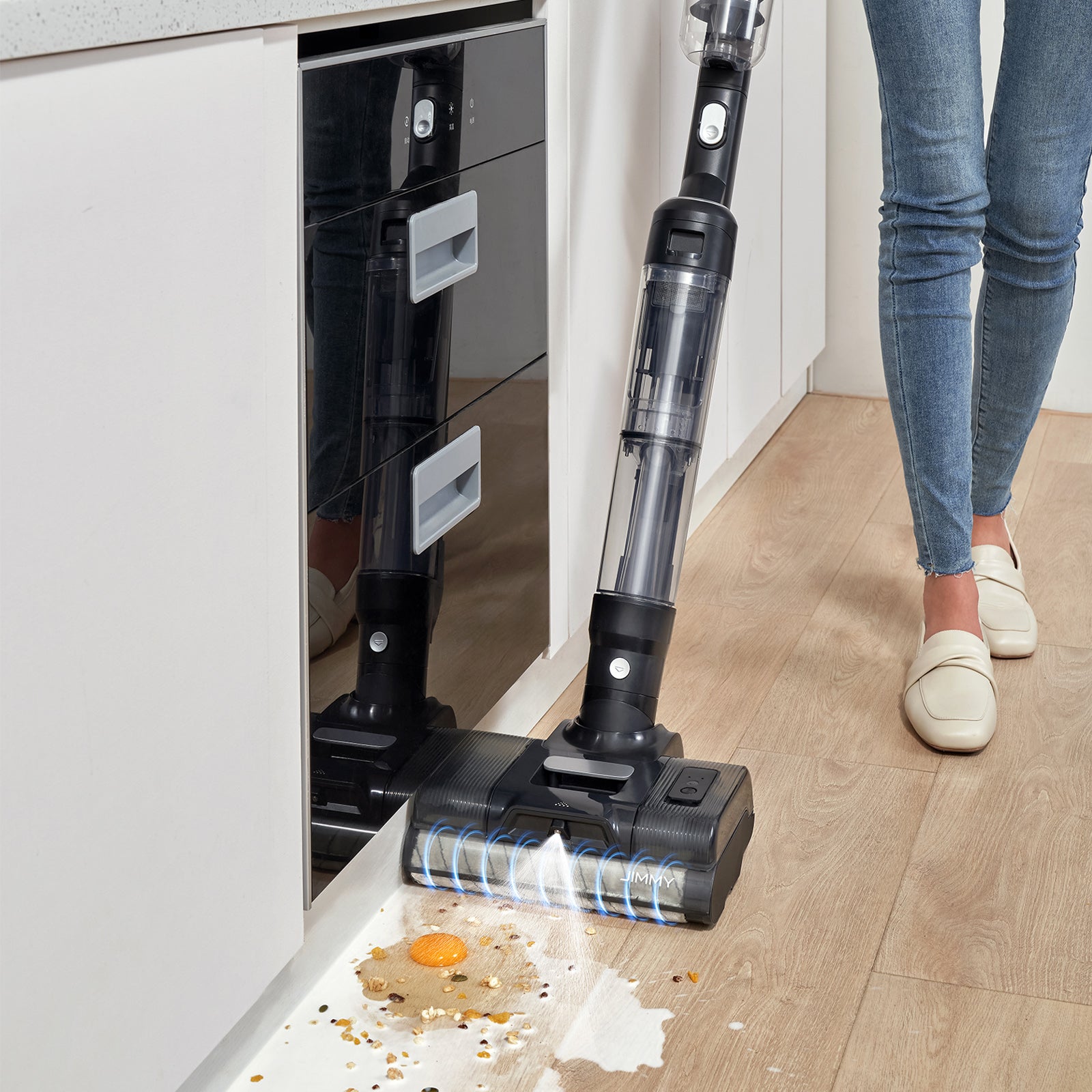 JIMMY PW11 is equipped with an anti-back flow device and can be laid almost flat at 180 degrees, making it easy to clean small spaces like the underside of sofas, beds, chairs, and more.