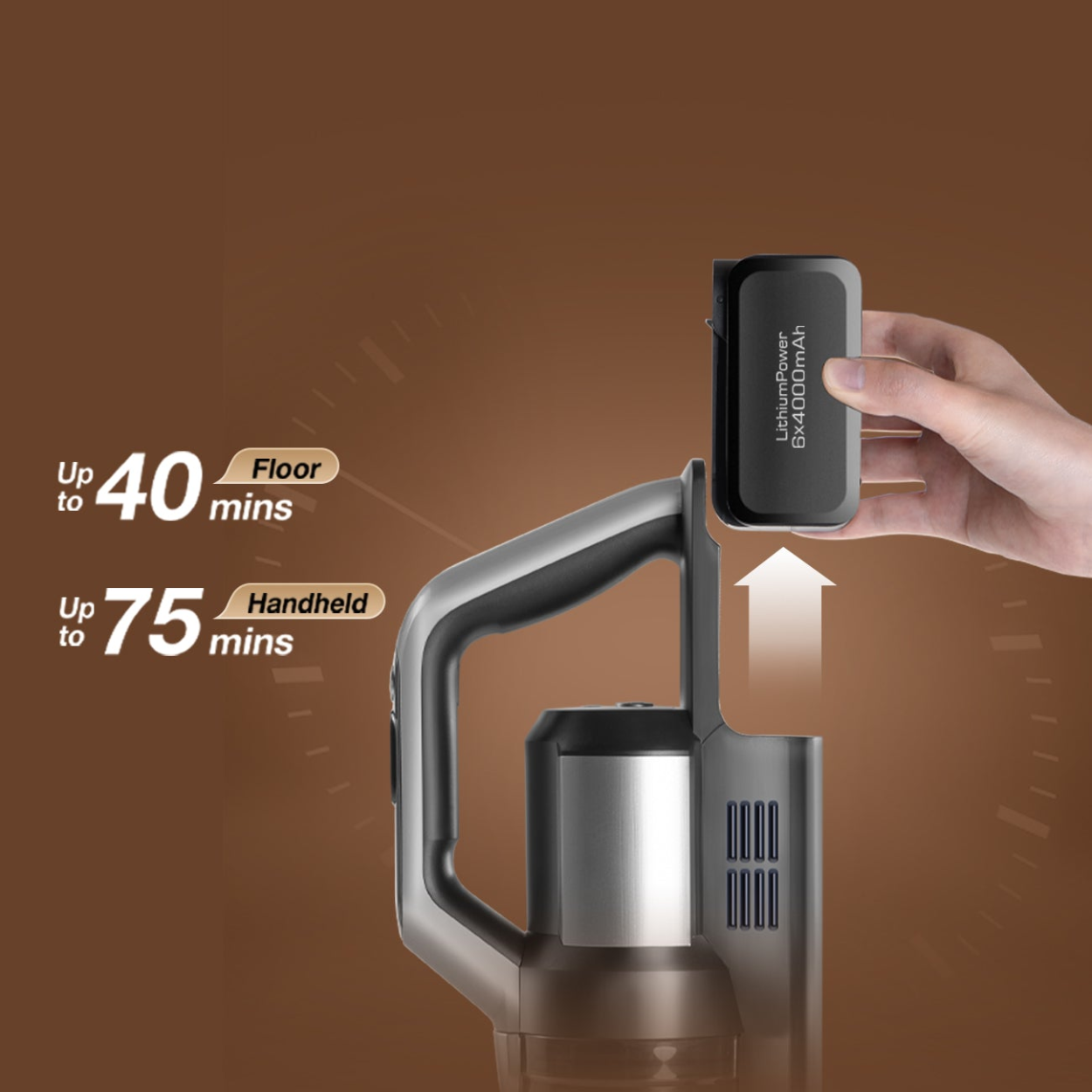 4000mAh big capacity Samsung battery, provides up to 40 minutes* of cleaning time on floor and up to 75 minutes* cleaning time with handheld vacuum. The replaceable battery pack allows you to double working time and double service life of the cleaner.* Carpet cleaning time: Up to 20 mins* Handheld cleaning time in carpet mode: Up to 35 mins
