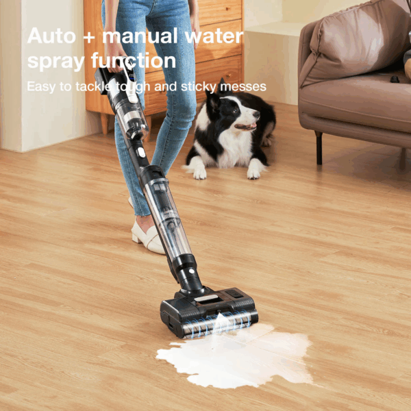 Auto water spray: Clean water is automatically and evenly dispersed on the roller brush to wash and mop the floor with fresh water.