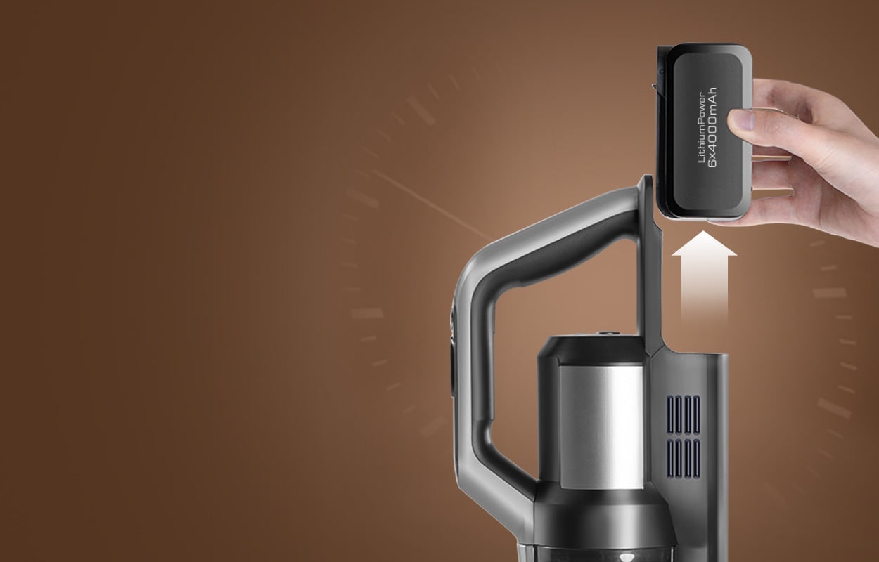 4000mAh big capacity Samsung battery, provides up to 40 minutes* of cleaning time on floor and up to 75 minutes* cleaning time with handheld vacuum. The replaceable battery pack allows you to double working time and double service life of the cleaner.* Carpet cleaning time: Up to 20 mins* Handheld cleaning time in carpet mode: Up to 35 mins