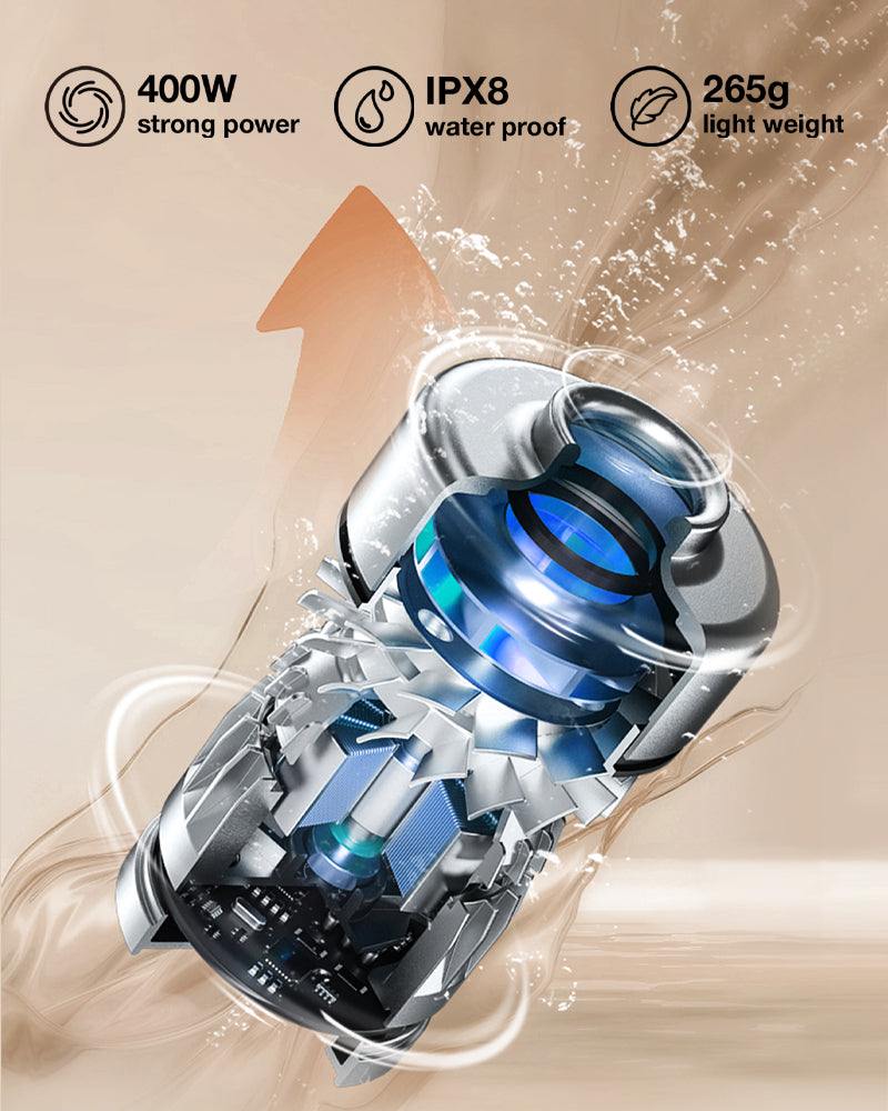 The patented brushless motor is made with light weight aluminum magnesium alloy, creates 400W strong power, and also achieves IPX8 waterproof level. Enables excellent and reliable cleaning performance on floor, carpet, bed and other areas.