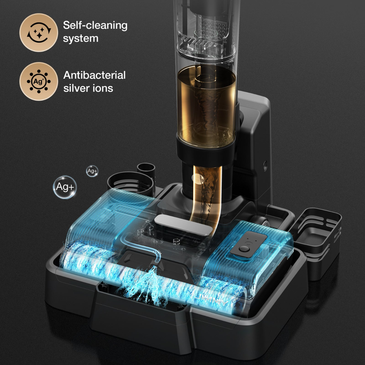 Just put the machine on the base and click a button, the machine start to use clean water to clean the brush roller and air duct. The intelligent design free your hands and also make home smell-free. Clean water tank built-in with antibacterial silver ion mat- erial, which generates antibacterial silver ions in clean w- ater and provide long term health care.